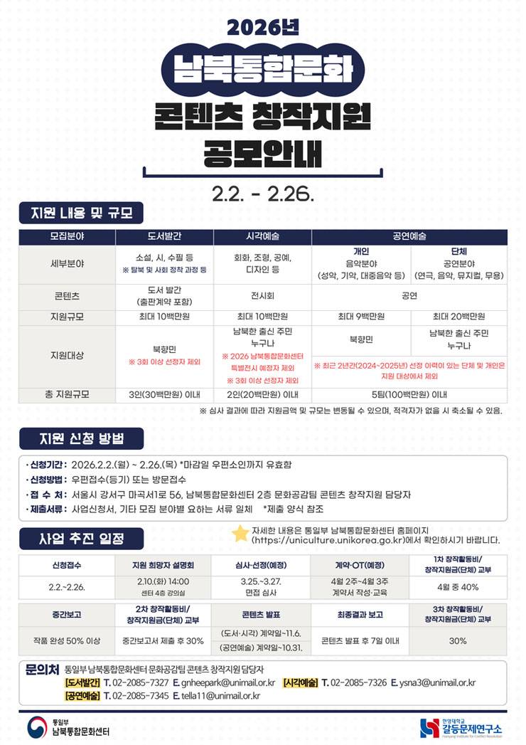 2026년 남북통합문화 콘텐츠 창작지원 공모2026년 남북통합문화 콘텐츠 창작지원 공모
