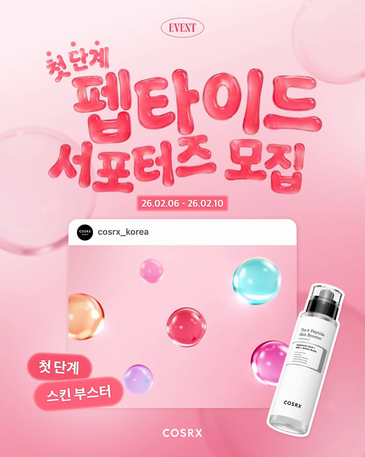 코스알엑스의 베스트셀러 첫 단계 스킨 부스터의 [더 6 펩타이드 스킨 부스터 세럼] 의 제품력을 입증하고 채널을 함께 성장시키고 싶은 서포터즈를 모집합니다💖