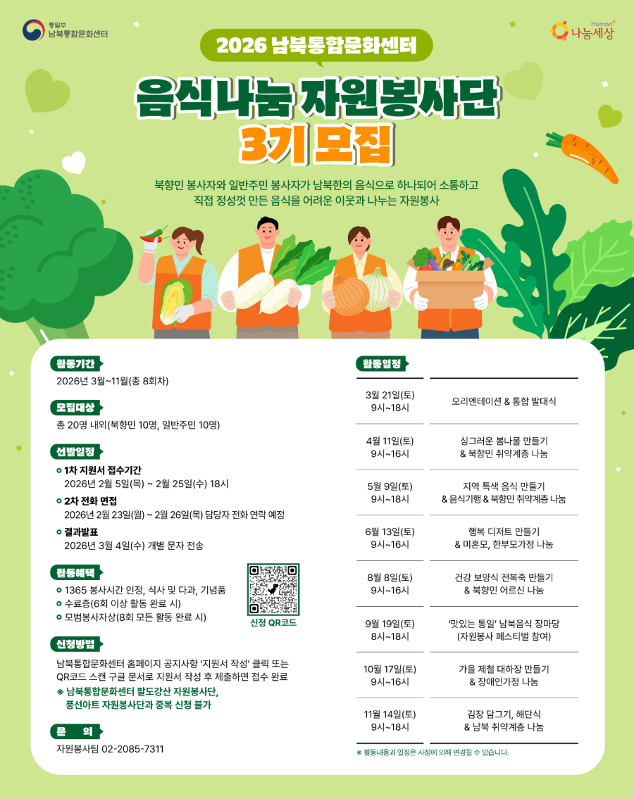 2026 남북통합문화센터 음식나눔 자원봉사단 3기 모집2026년 남북통합문화센터 음식나눔 자원봉사단 3기 모집