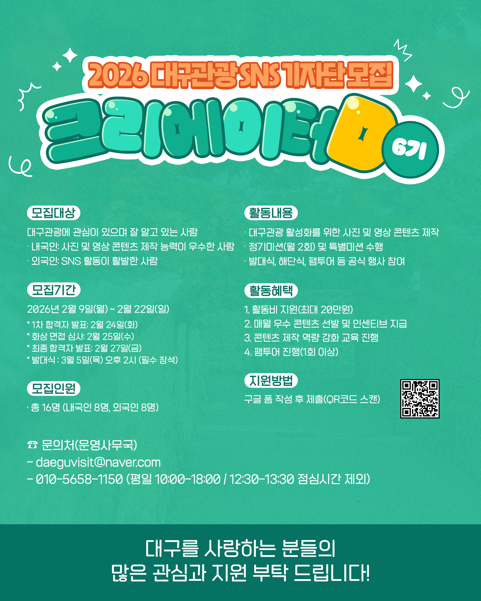 2026 대구관광 SNS 기자단 크리에이터D 6기 모집📢 2026 대구관광 SNS 기자단 크리에이터D 6기 모집