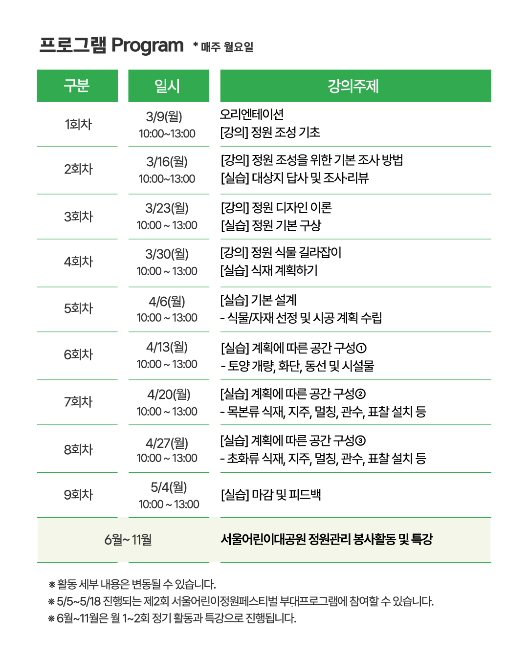 ① 정원 조성 교육 : 3.9.(월) ~ 5.4.(월) 매주 월요일 10:00~13:00② 자원봉사활동 및 특강 : 6월~11월 (월 1~2회 정기 모임) |
