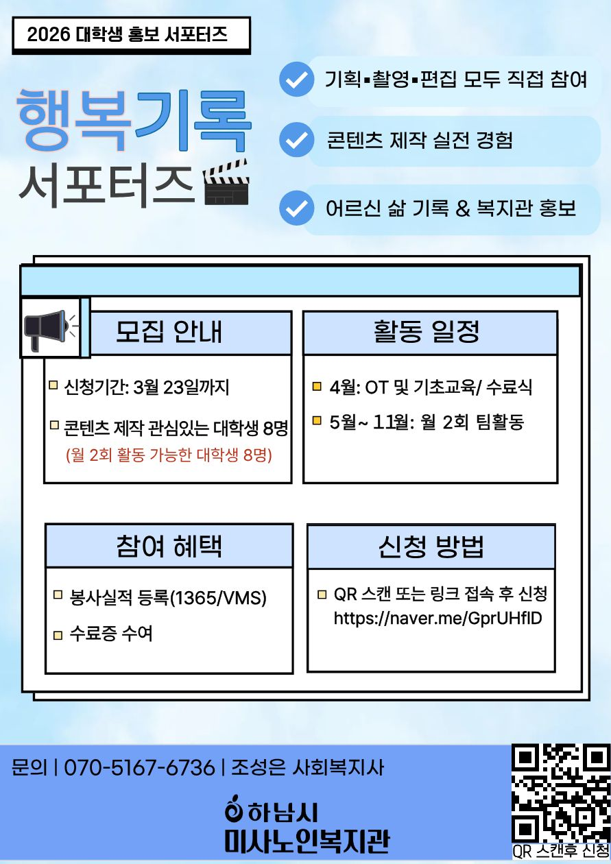- 2026 하남시미사노인복지관 대학생 홍보 서포터즈 「어르신 행복기록」 모집