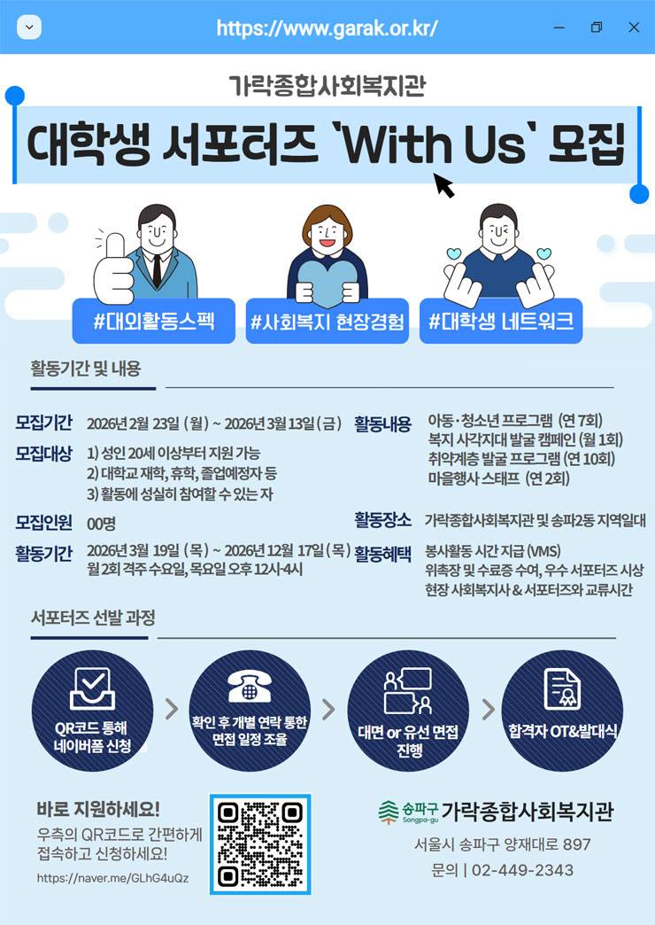 가락종합사회복지관 2026 대학생 서포터즈 With Us 3기 모집가락종합사회복지관 2026 대학생 서포터즈 With Us 3기 모집