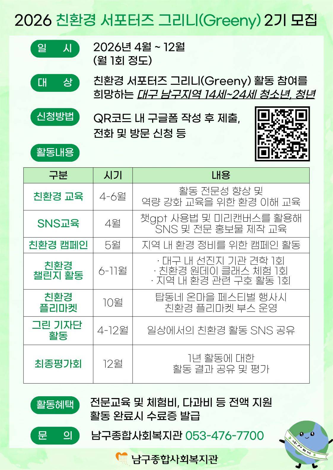 [남구종합사회복지관] 2026 친환경 서포터즈 그리니(Greeny) 2기 모집[남구종합사회복지관] 2026 친환경 서포터즈 그리니(Greeny) 2기 모집