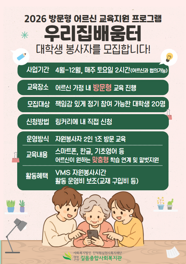 [길음종합사회복지관] 방문형 어르신 교육지원사업 '우리집 배움터' 대학생 봉사자 모집길음종합사회복지관 방문형 어르신 교육지원프로그램 '우리집 배움터' 대학생 봉사자를 모집합니다.