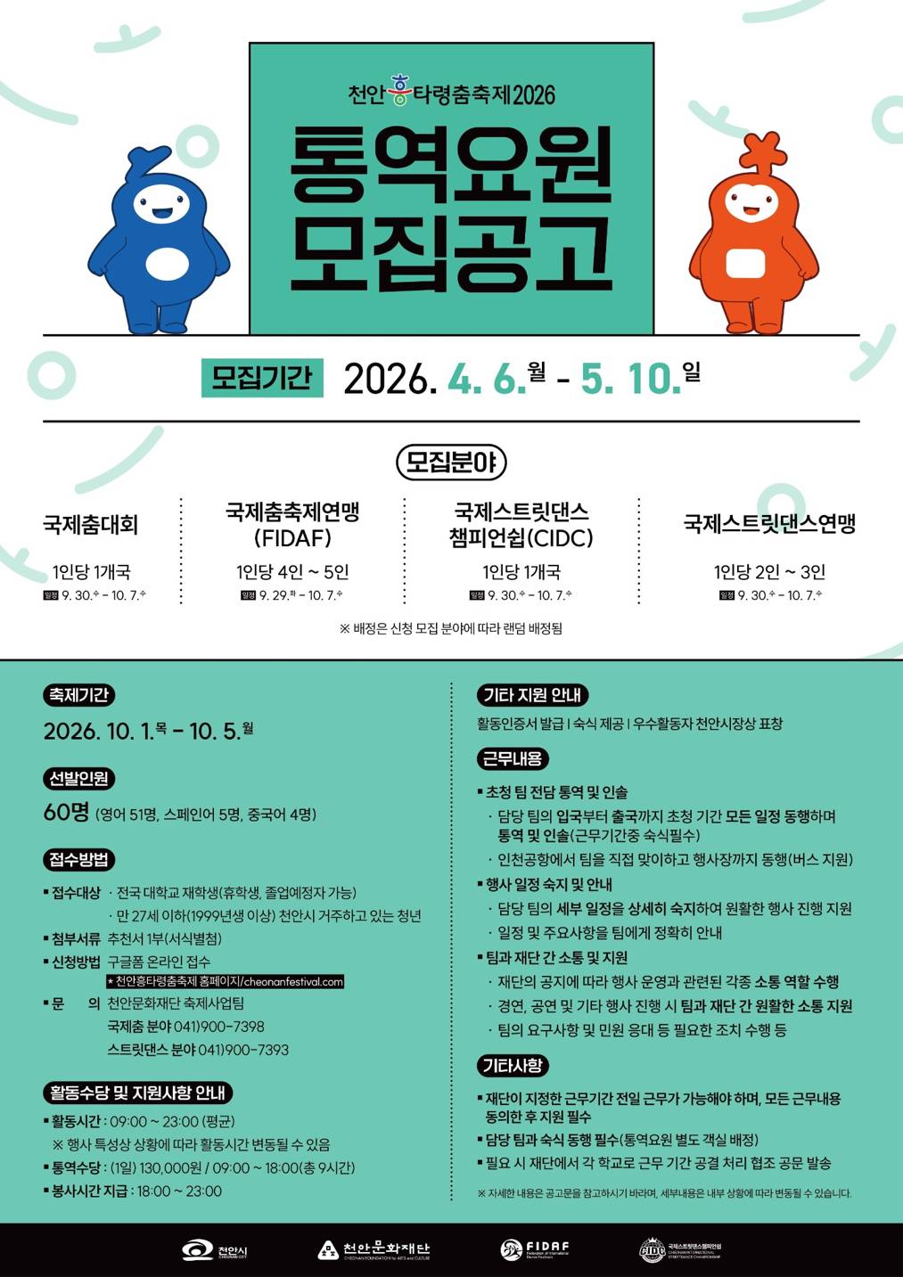 천안흥타령춤축제 2026 통역요원 모집글로벌 춤축제 천안흥타령춤축제 2026 통역요원 모집