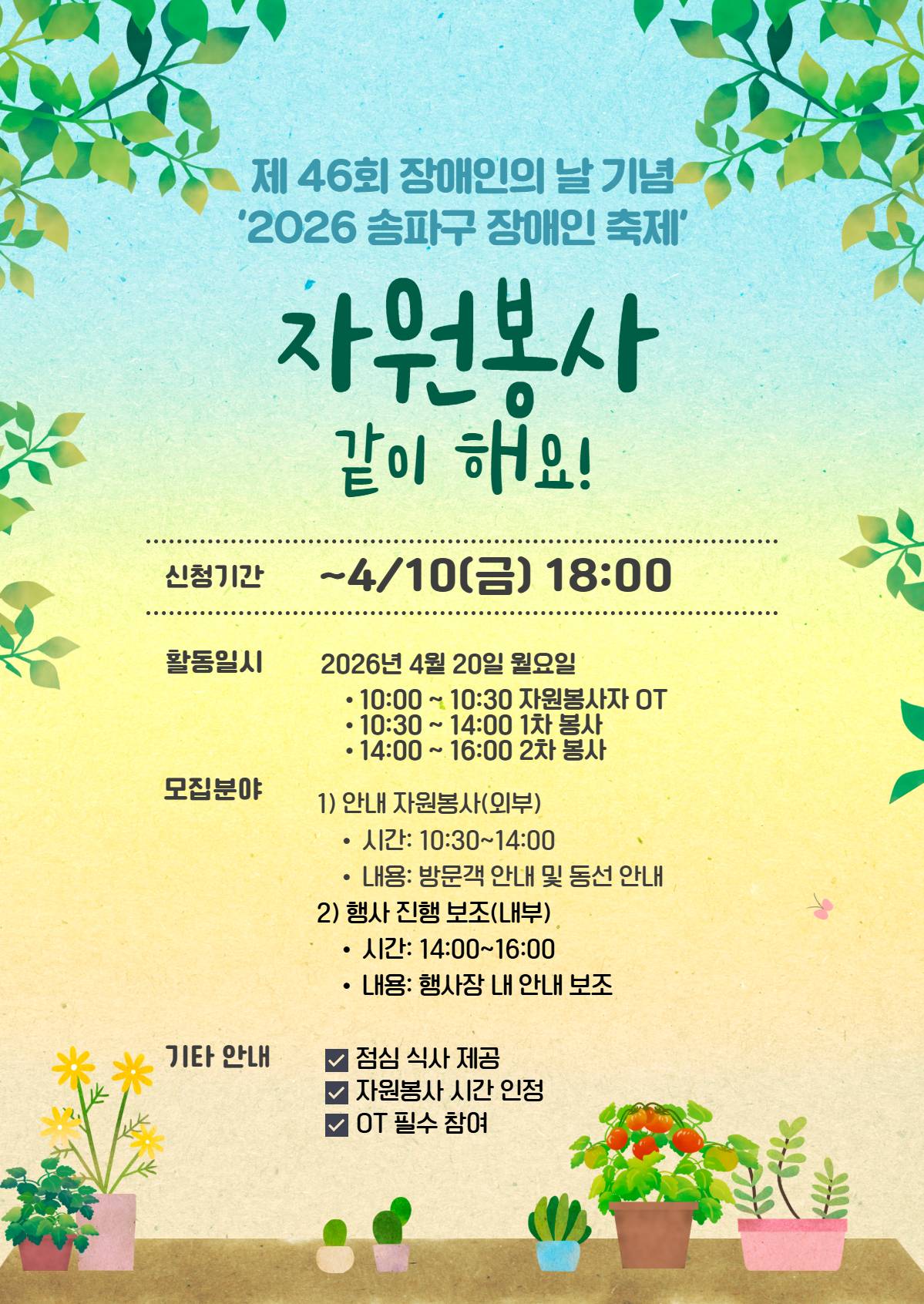 - 활동장소: 송파구청 대강당- 혜택: 점심 제공 + 봉사시간 인정