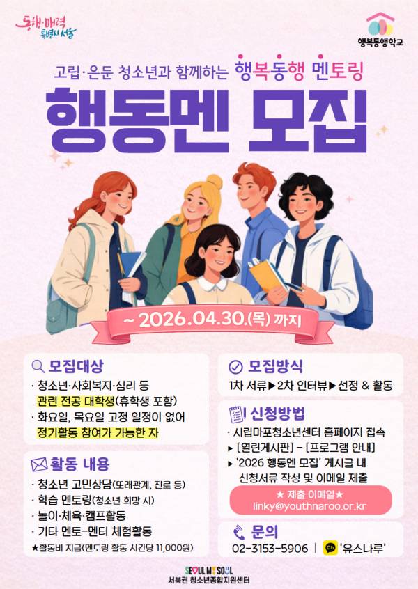 2026 시립마포청소년센터 서북권 행복동행학교 유스톡 프로젝트 “행복동행 멘토링” 대학생 멘토 모집!■ 멘토 모집 대상