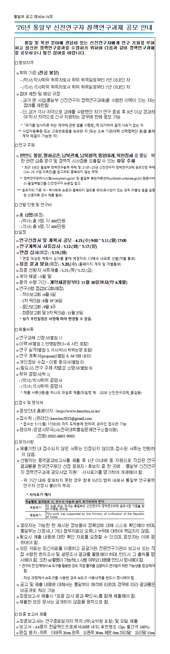 o 공고 및 제출 내용에 대해서는 통일부의 해석에 따르며, 경우에 따라 결과물은 비공개로 처리 가능
