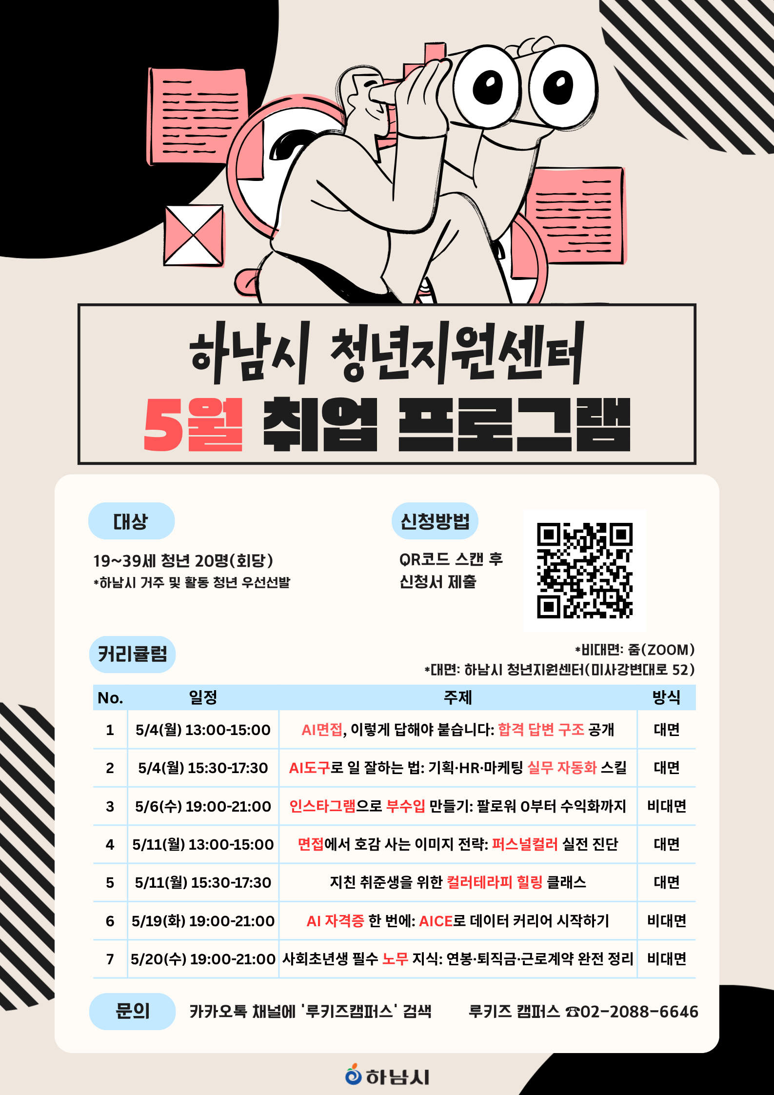 ✔회차별 20명 선발 예정인데, 신청자가 많을 경우 선착순+하남시 청년 우선 선발합니다.