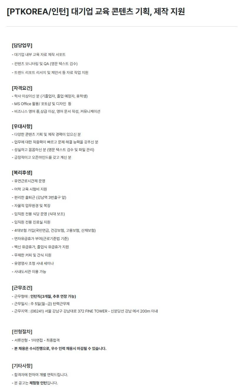 [PTKOREA] 대기업 교육 콘텐츠 기획, 제작 지원 (인턴)