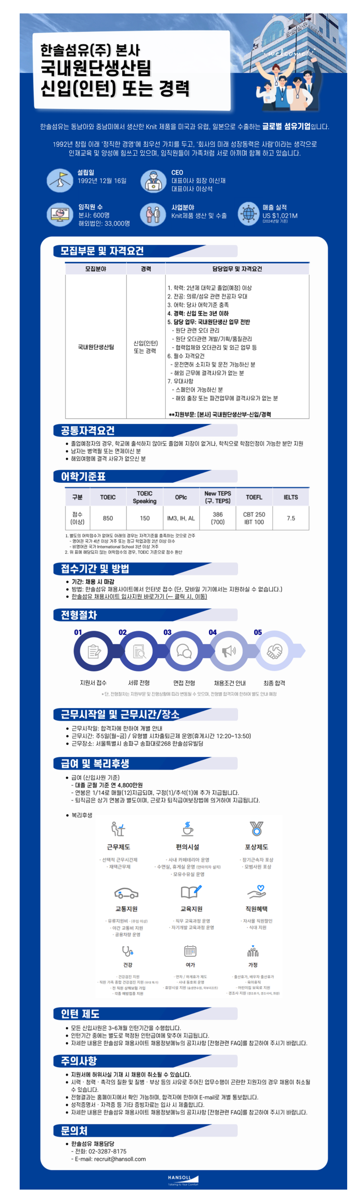 [한솔섬유] [본사] 국내원단생산팀 신입(인턴) 또는 경력