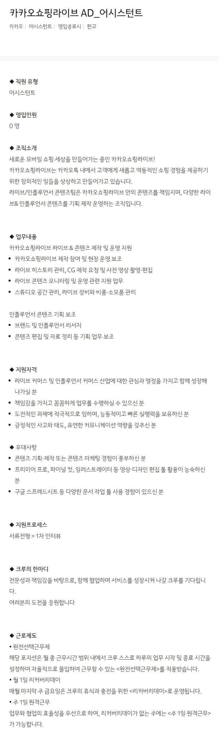- 카카오쇼핑라이브 라이브 & 콘텐츠 제작 및 운영 지원