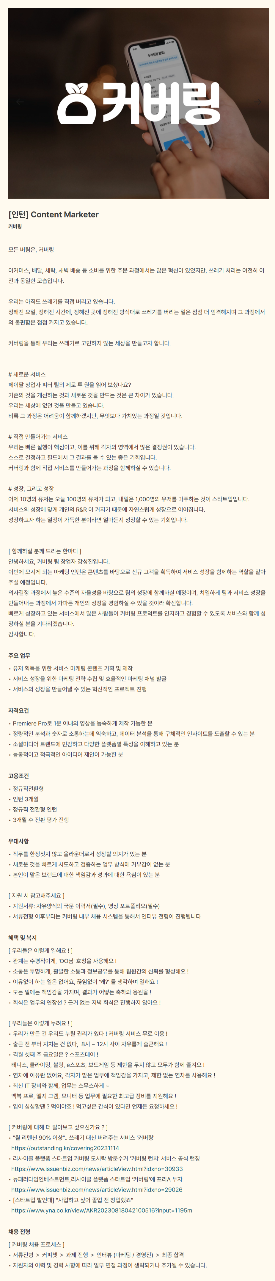 서류전형 > 커피챗 > 과제 진행 > 인터뷰 (마케팅 / 경영진) > 최종 합격