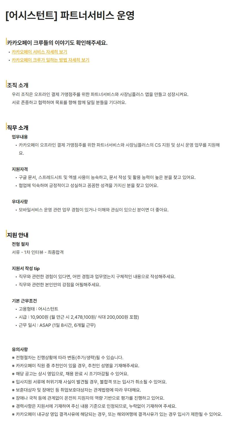 [카카오페이] [어시스턴트] 파트너서비스 운영