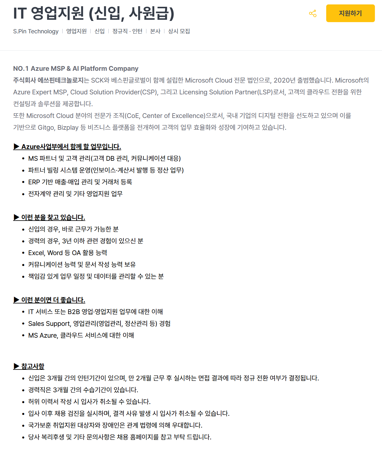 [에쓰핀테크놀로지] IT 영업지원 (신입, 사원급)