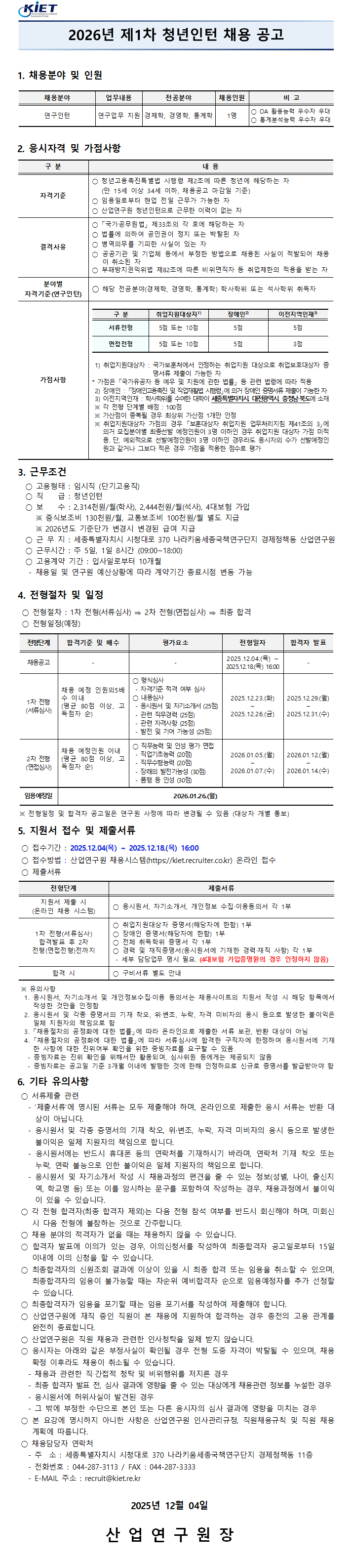 [산업연구원] 2026년 제1차 청년인턴 채용공고