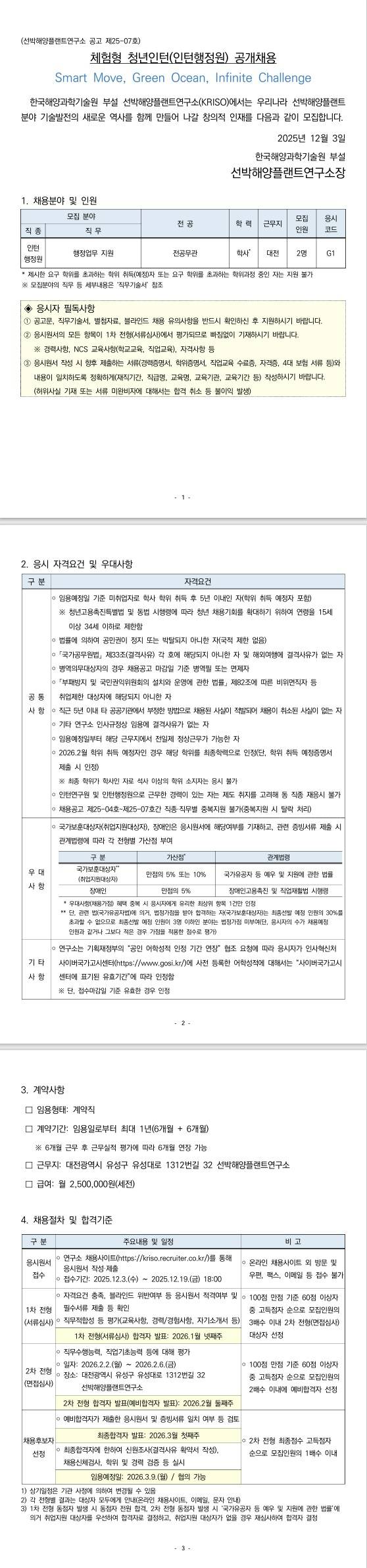 [선박해양플랜트연구소] 2025년 하반기 체험형 청년인턴(인턴행정원) 공개채용