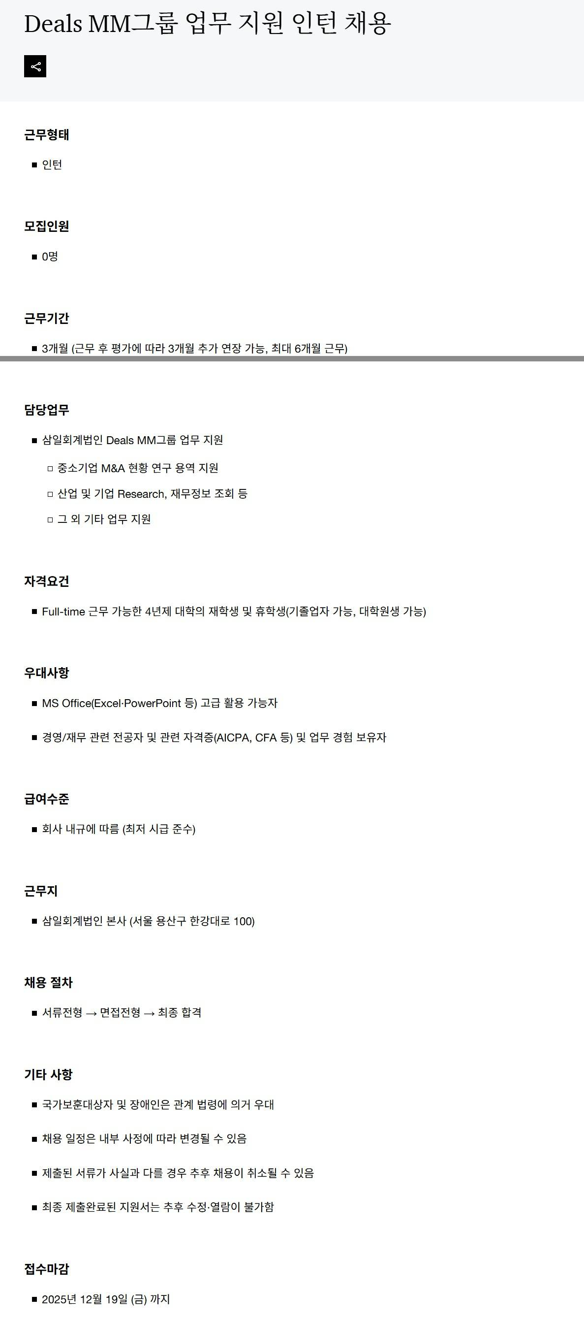 [삼일회계법인] Deals MM그룹 업무 지원 인턴 채용