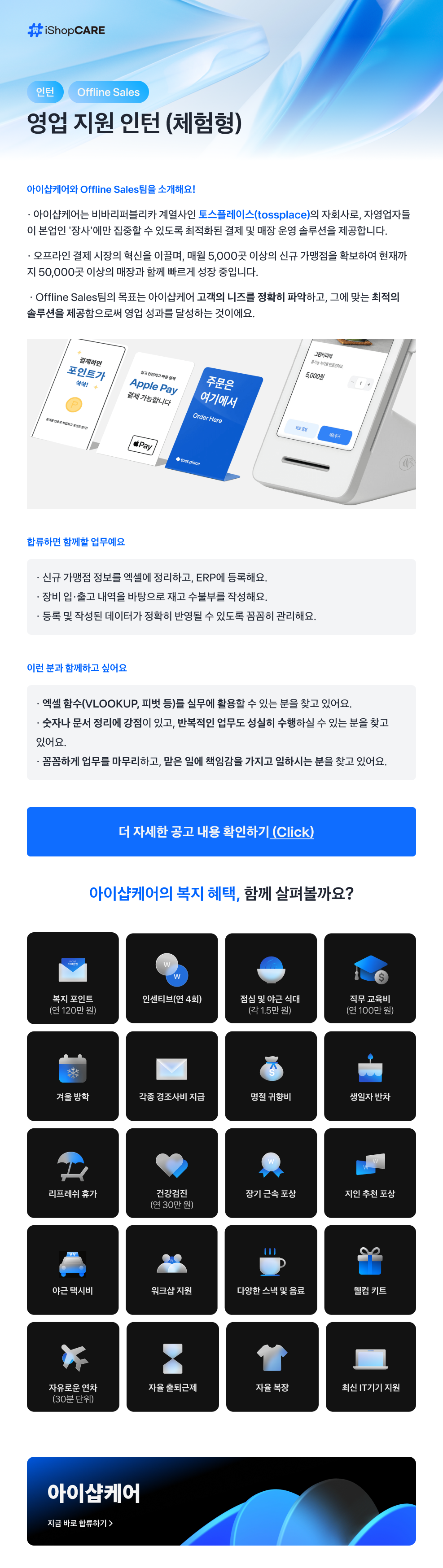 [토스플레이스 자회사/iShopCARE] 영업 지원 인턴 (체험형)
