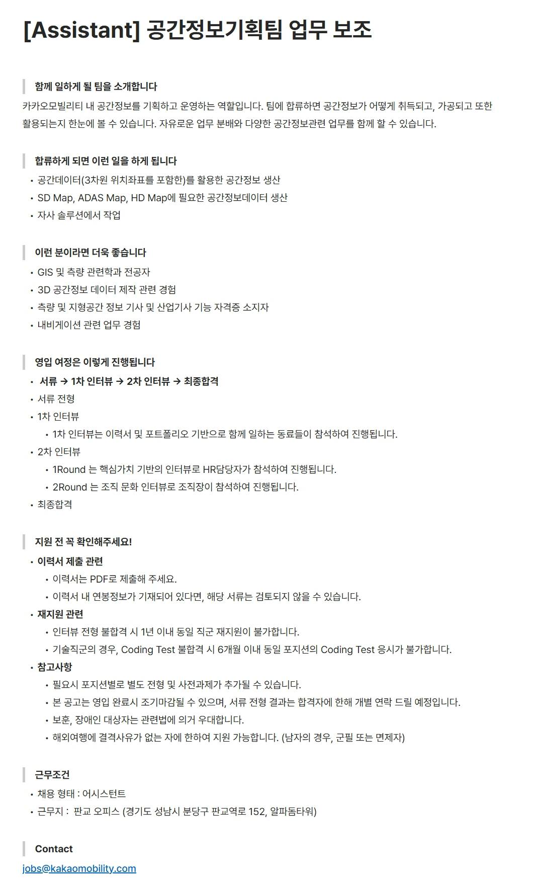 [카카오모빌리티] [Assistant] 공간정보기획팀 업무 보조