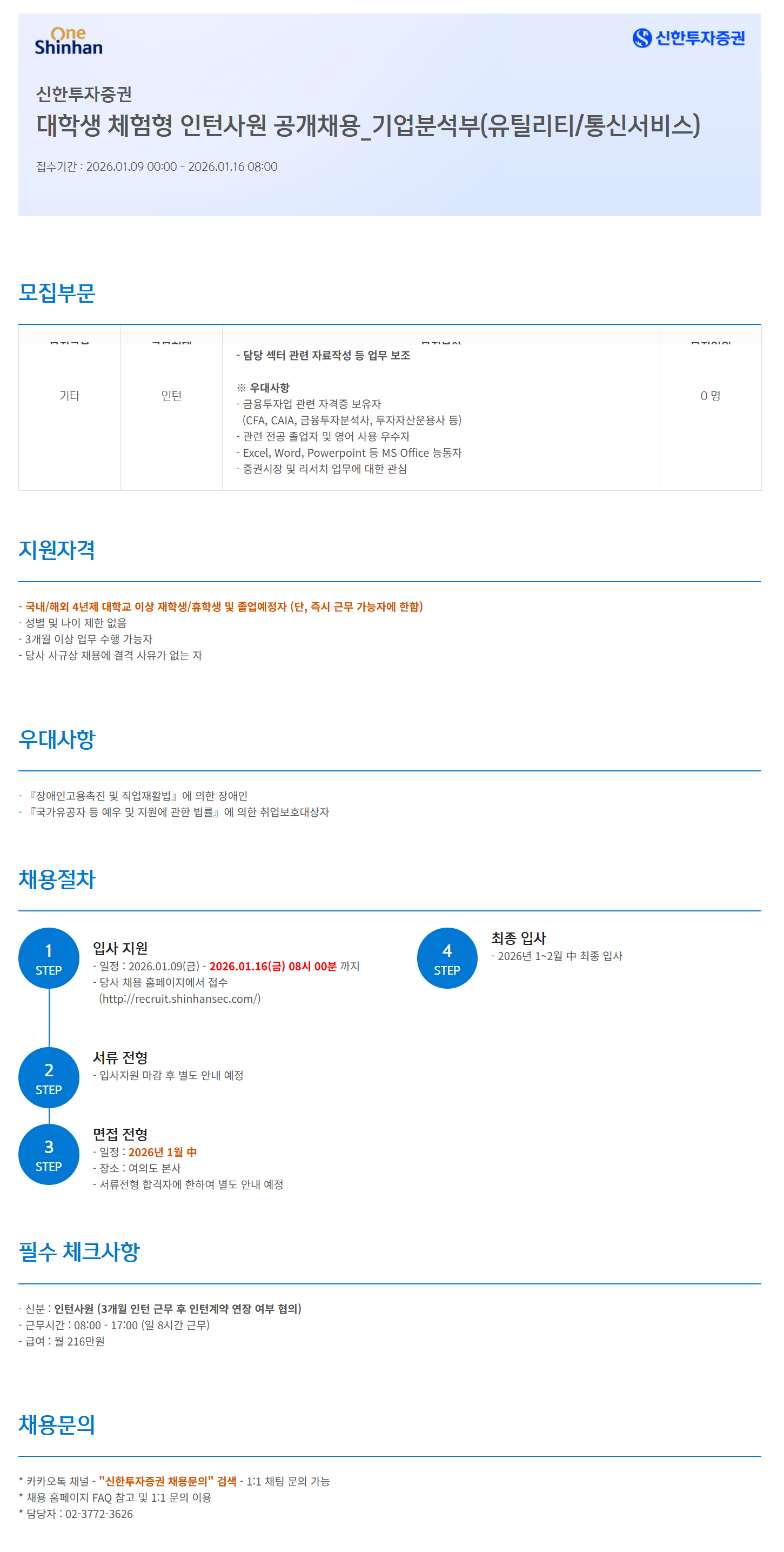 [신한투자증권] 대학생 체험형 인턴사원 공개채용_기업분석부(유틸리티/통신서비스)