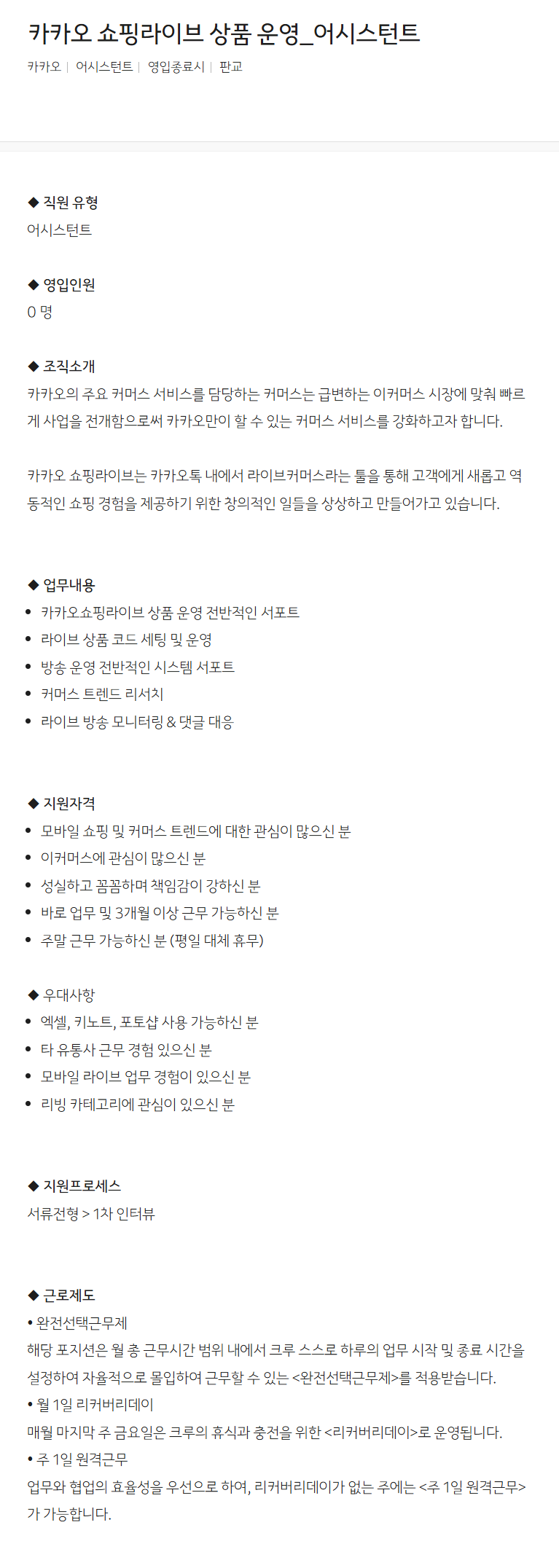 [카카오] 쇼핑라이브 상품 운영_어시스턴트