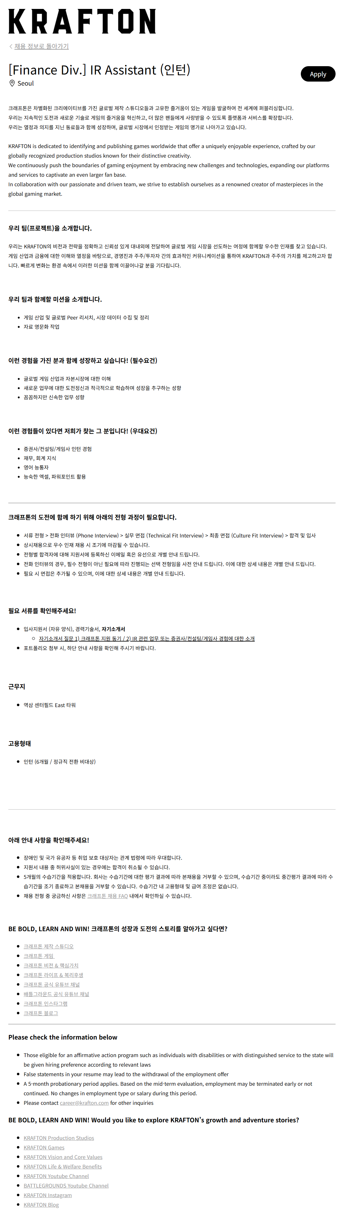 [크래프톤] [Finance Div.] IR Assistant (인턴)