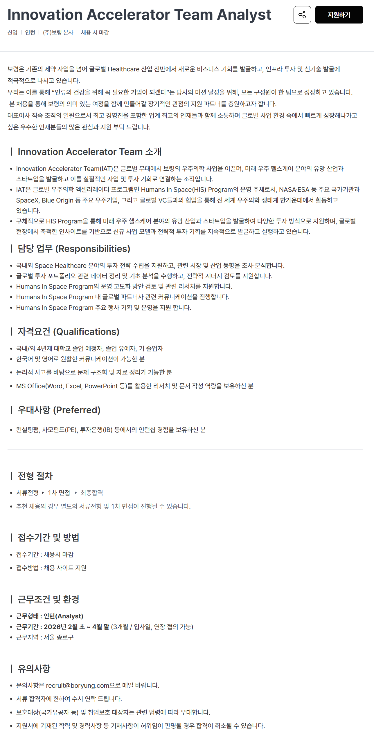 [보령] Innovation Accelerator Team Analyst