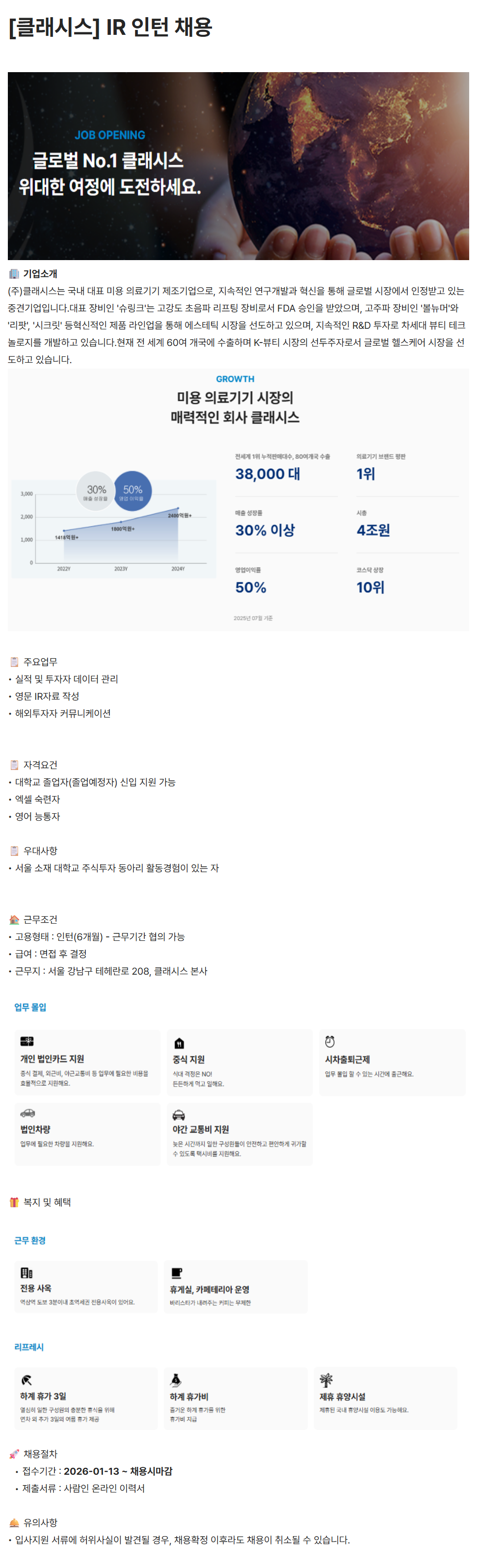 [클래시스] IR 인턴 채용
