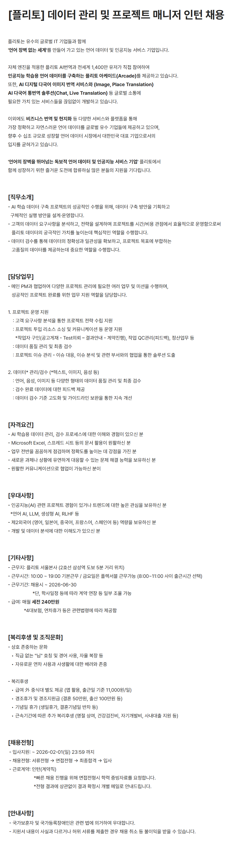 [플리토] 데이터 관리 및 프로젝트 매니저 인턴 채용