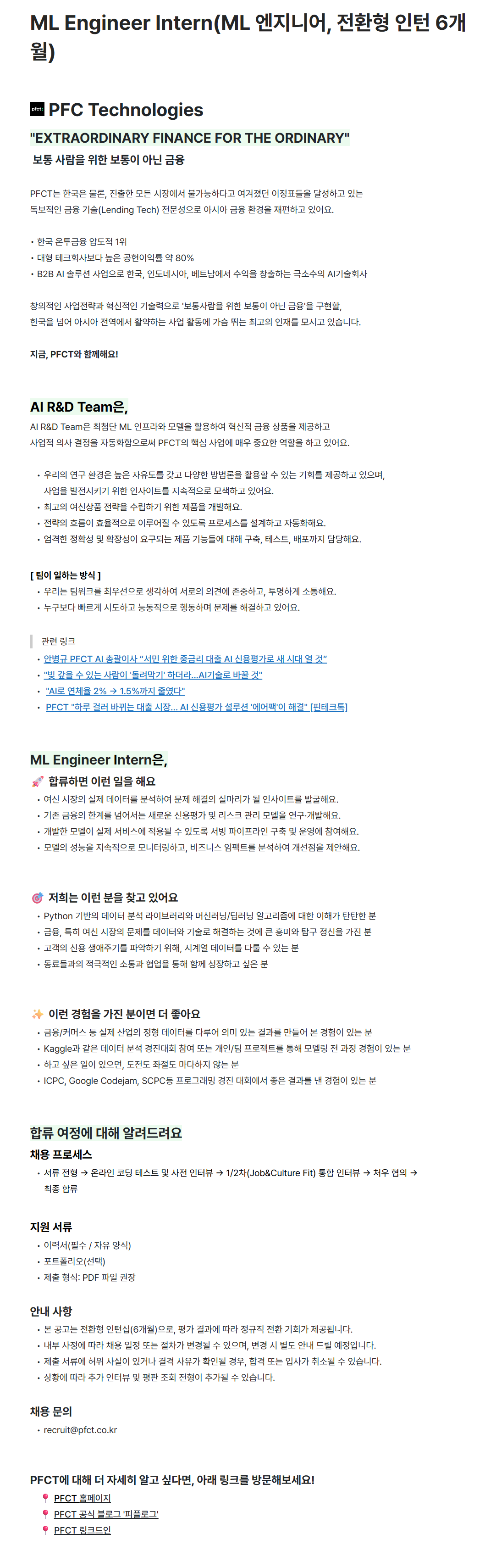 [피에프씨테크놀로지스] ML Engineer Intern(ML 엔지니어, 전환형 인턴 6개월)