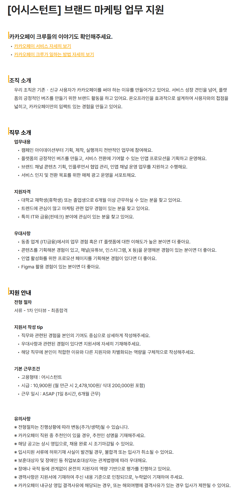 [카카오페이] [어시스턴트] 브랜드 마케팅 업무 지원