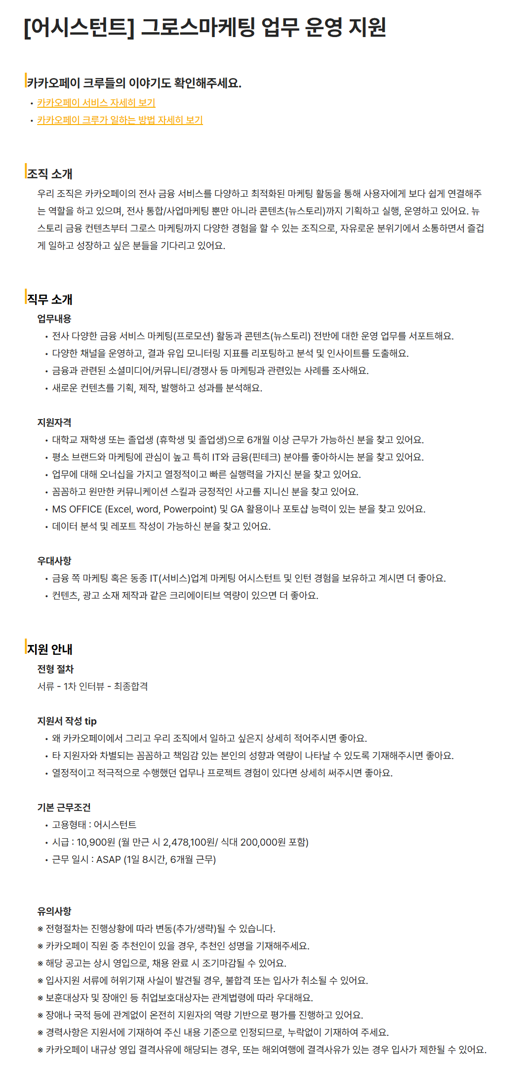 [카카오페이] [어시스턴트] 그로스마케팅 업무 운영 지원