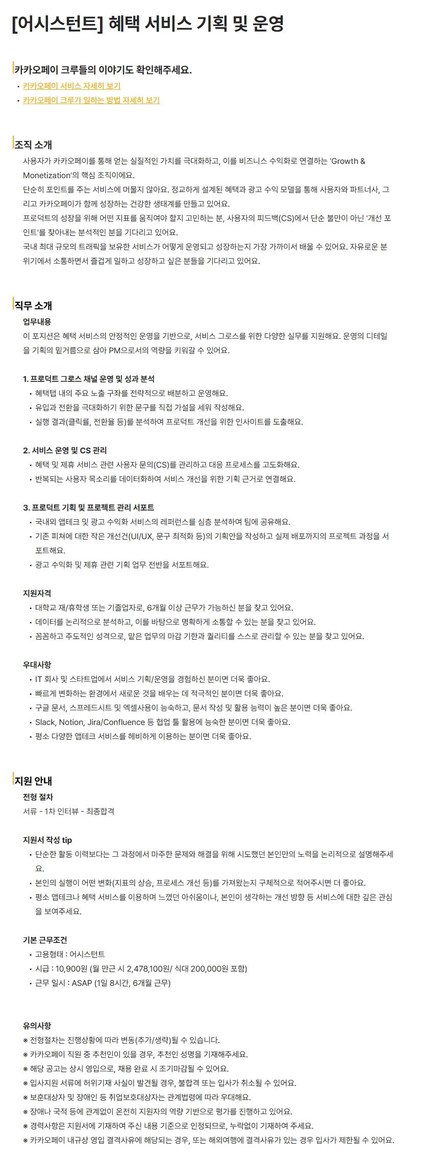 [카카오페이] [어시스턴트] 혜택 서비스 기획 및 운영