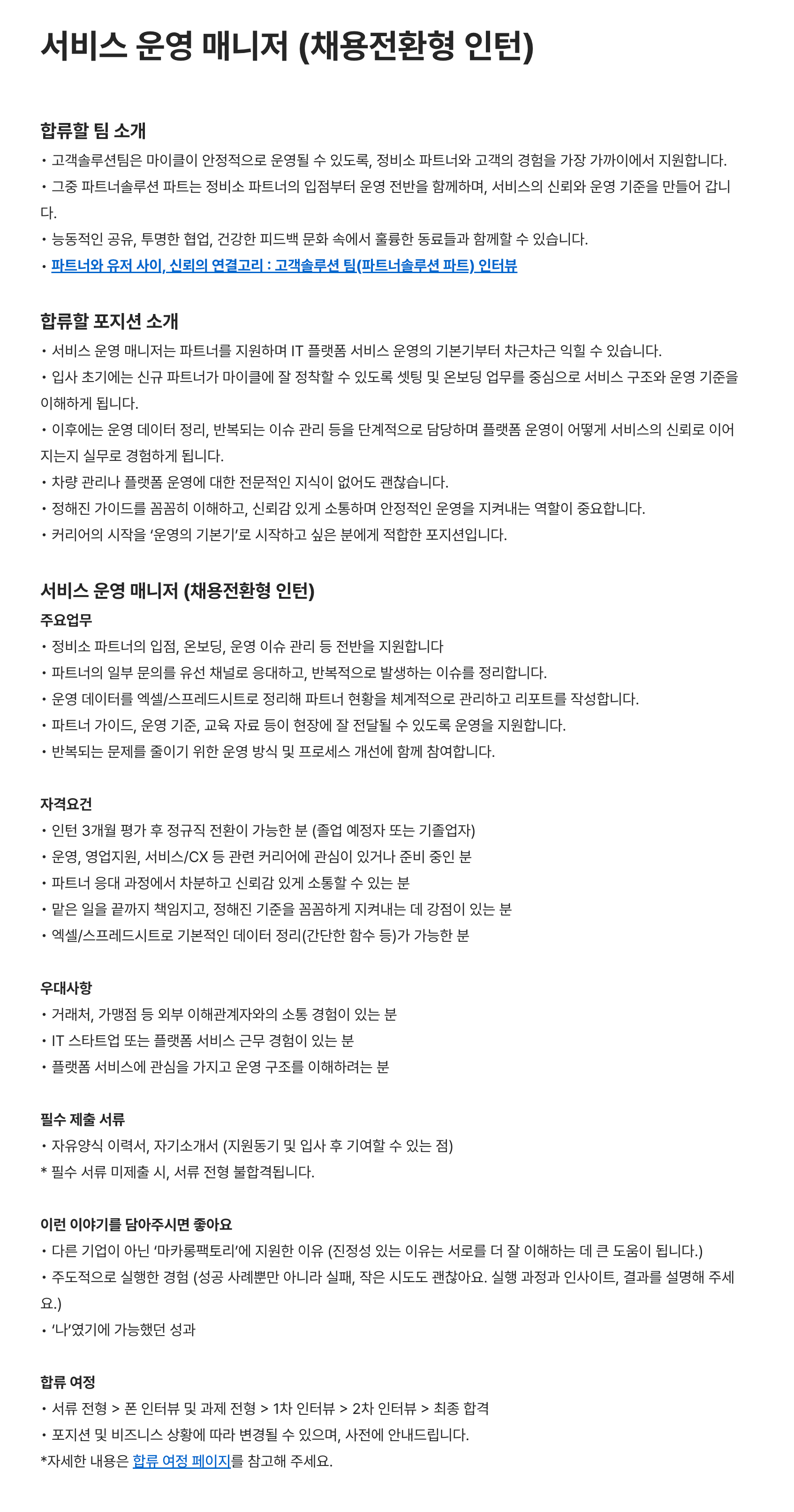 차량 관리 앱 1위 '마이클' 서비스 운영 매니저 (채용전환형 인턴)