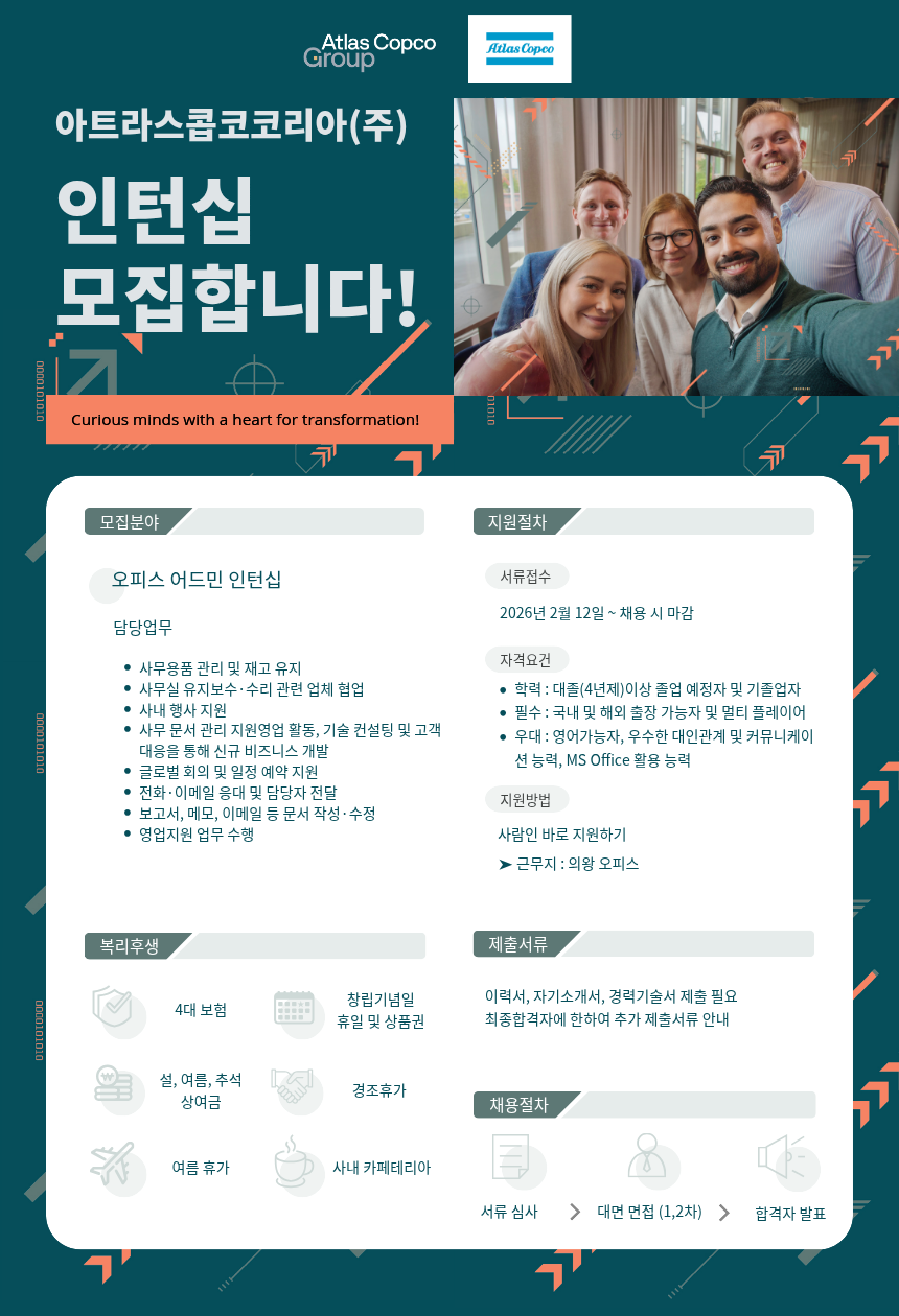 [아트라스콥코코리아] 오피스 어드민 인턴 12개월 (파견계약직)