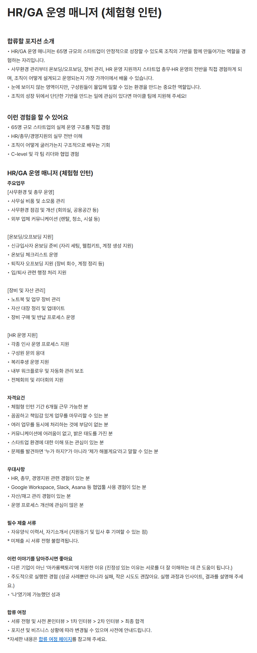 [마카롱팩토리] HR/GA 운영 매니저 (체험형 인턴)