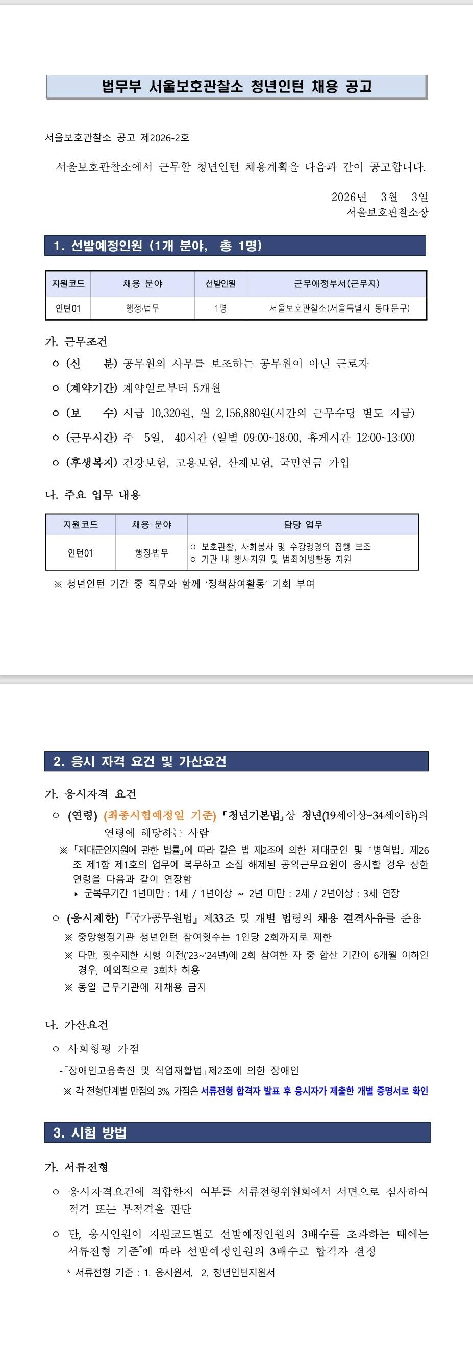 [서울보호관찰소] 2026년 제1회 법무부 서울보호관찰소 청년인턴 채용 공고