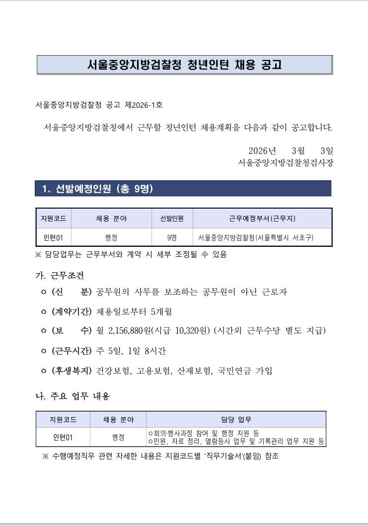 [서울중앙지방검찰청] 2026년 제1차 서울중앙지방검찰청 청년인턴 채용공고