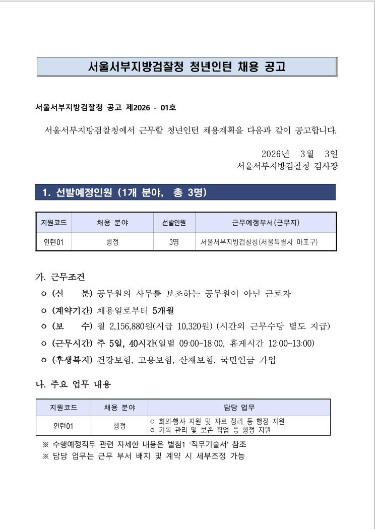 [서울서부지방검찰청] 2026년 제1차 서울서부지방검찰청 청년인턴 채용공고