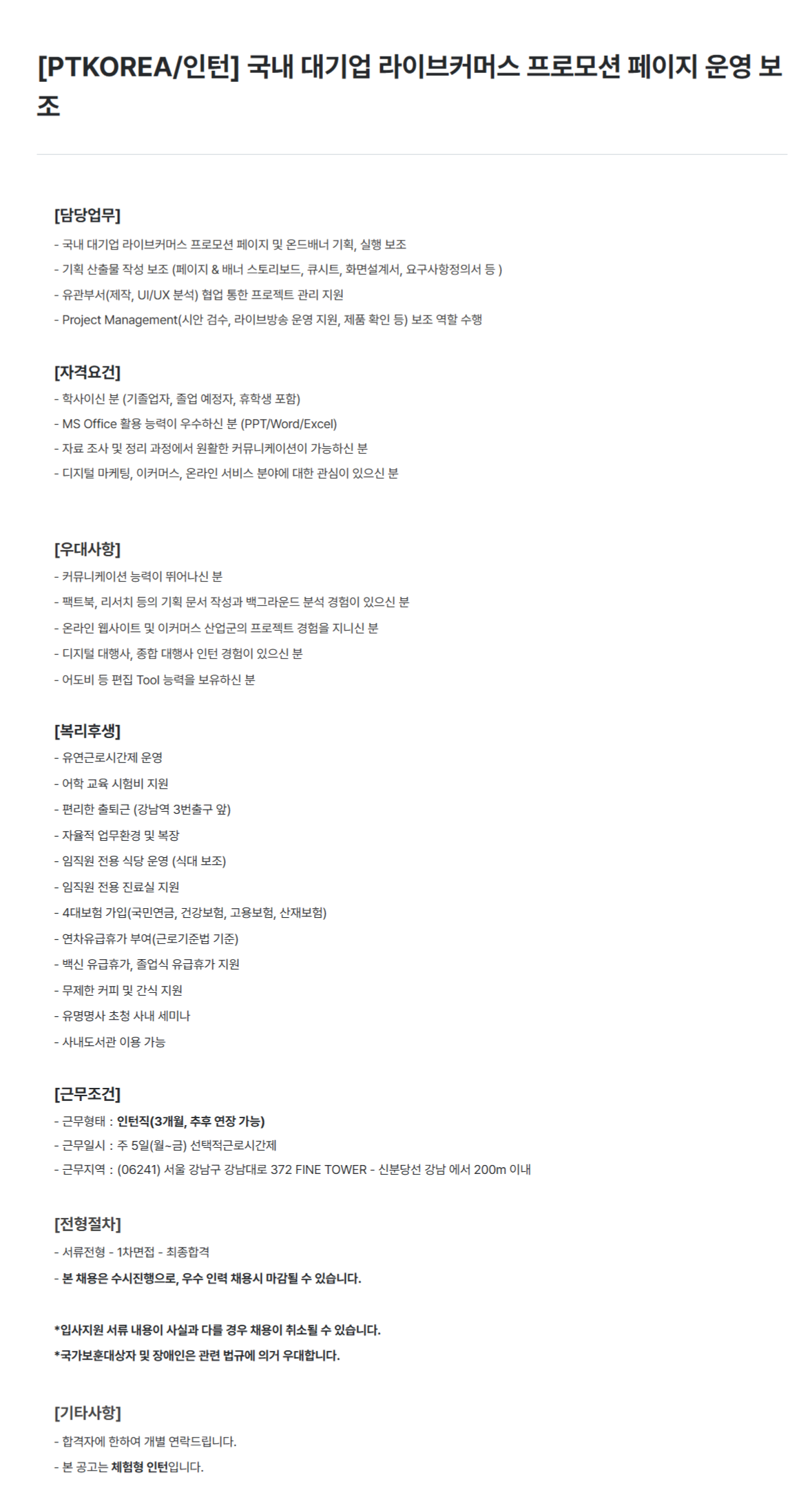 [PTKOREA] 국내 대기업 라이브커머스 프로모션 페이지 운영 보조 - 인턴