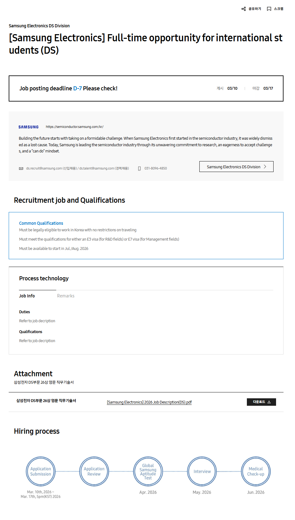 [삼성전자 DS부문] Full-time opportunity for international students (DS)