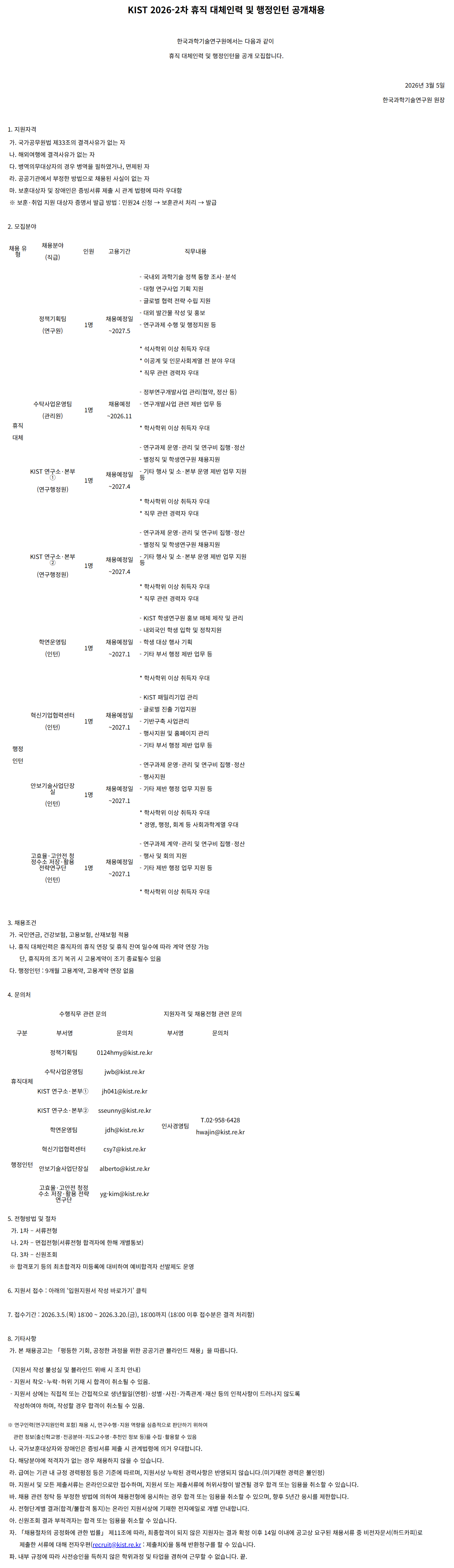 [한국과학기술연구원] KIST 2026-2차 휴직 대체인력 및 행정인턴 공개채용