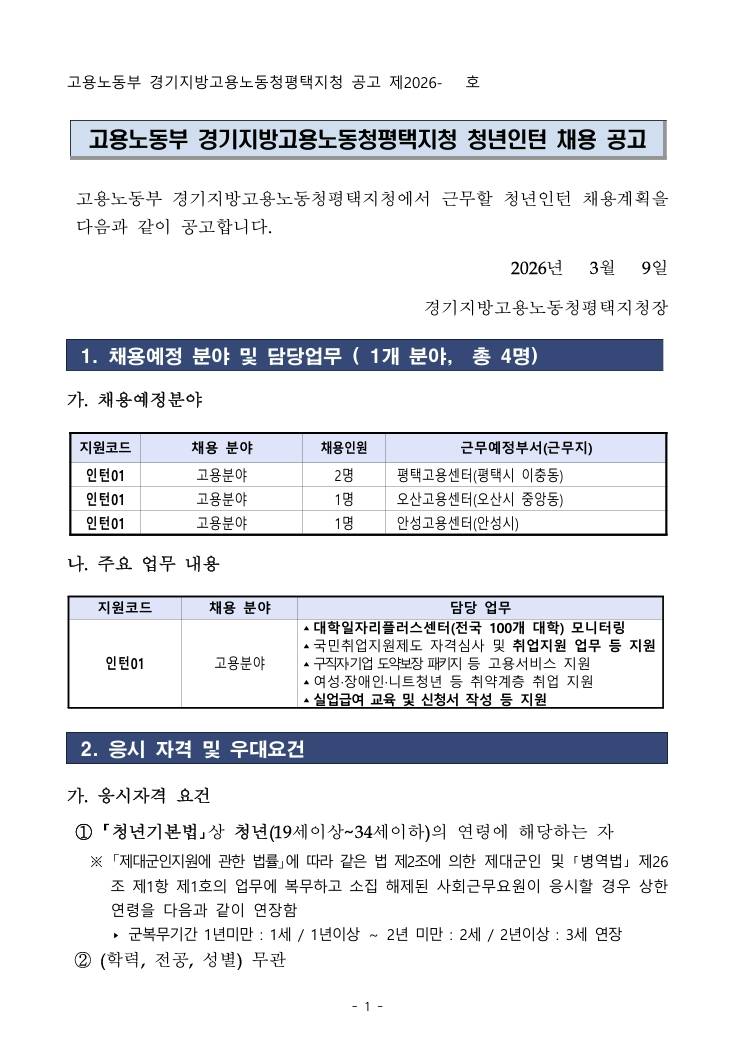 [평택고용노동지청] 고용노동부 경기지방고용노동청 평택지청 상반기 청년인턴 공고