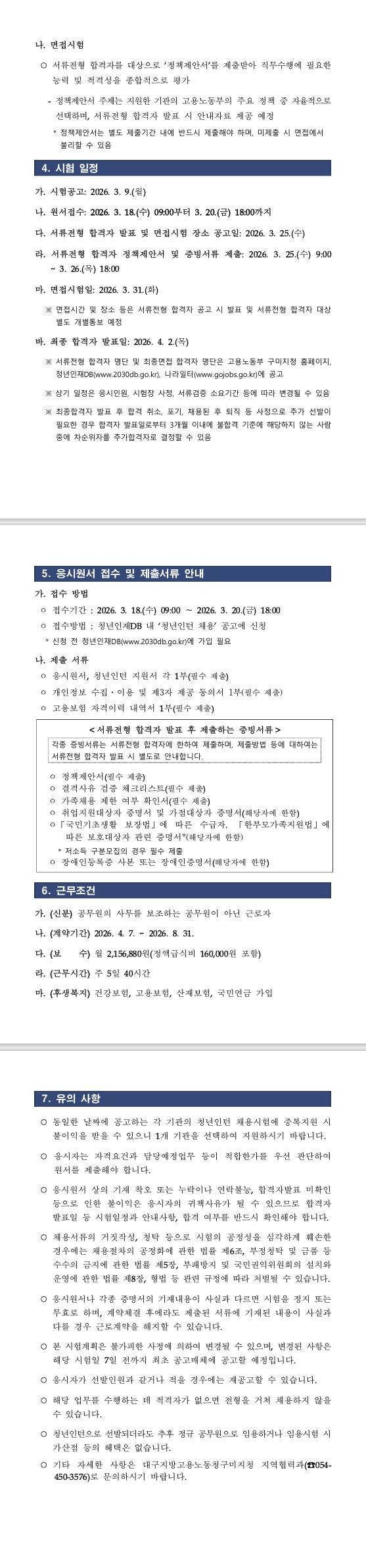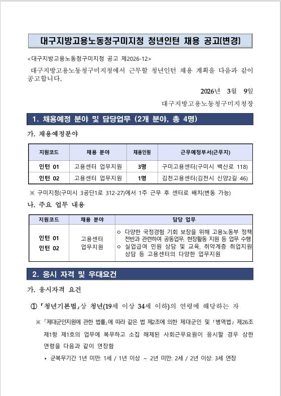 [구미고용노동지청] 2026년 상반기 고용노동부 구미지청 청년인턴 채용 공고(변경)