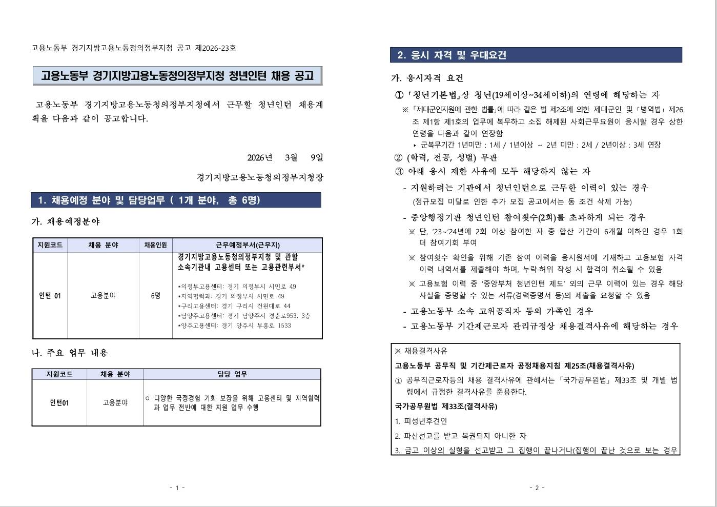 [의정부고용노동지청] 고용노동부 의정부지청 청년인턴 채용 공고