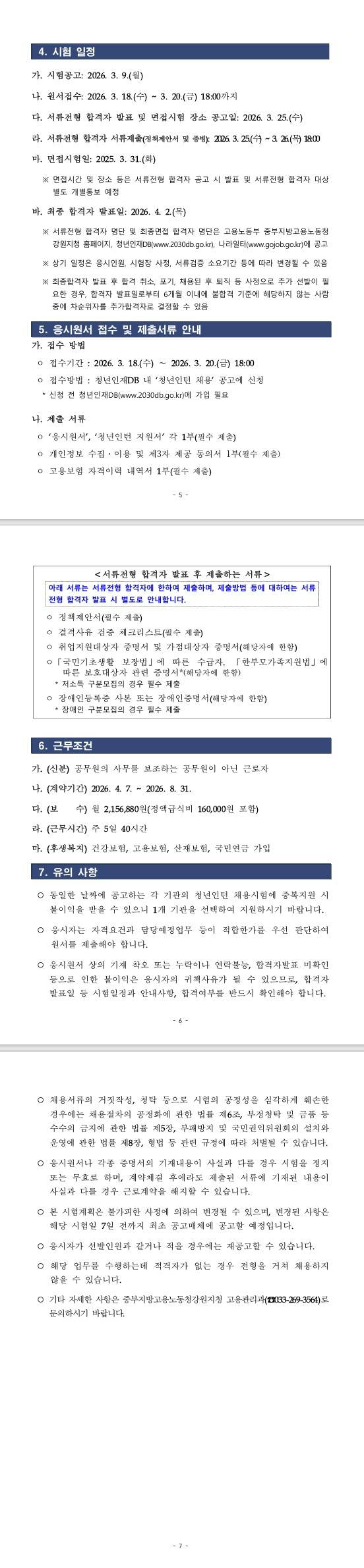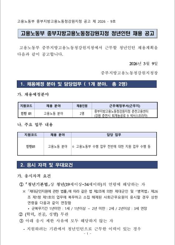 [강원고용노동지청] 2026년 중부지방고용노동청강원지청 상반기 청년인턴 채용 공고
