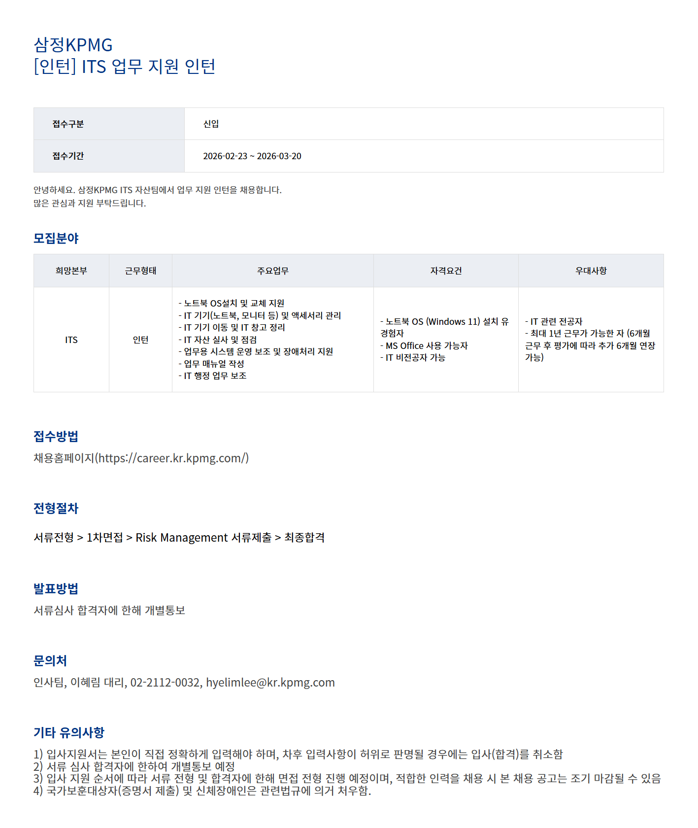 [삼정KPMG] ITS 업무 지원 인턴 채용