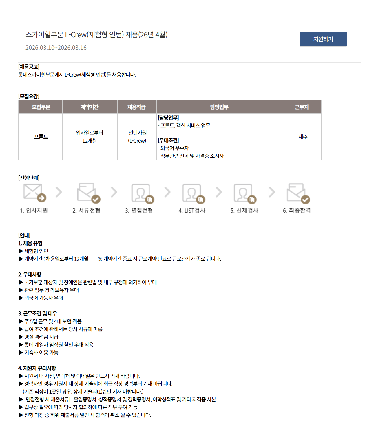[호텔롯데] 스카이힐부문 L-Crew(체험형 인턴) 채용(4월)